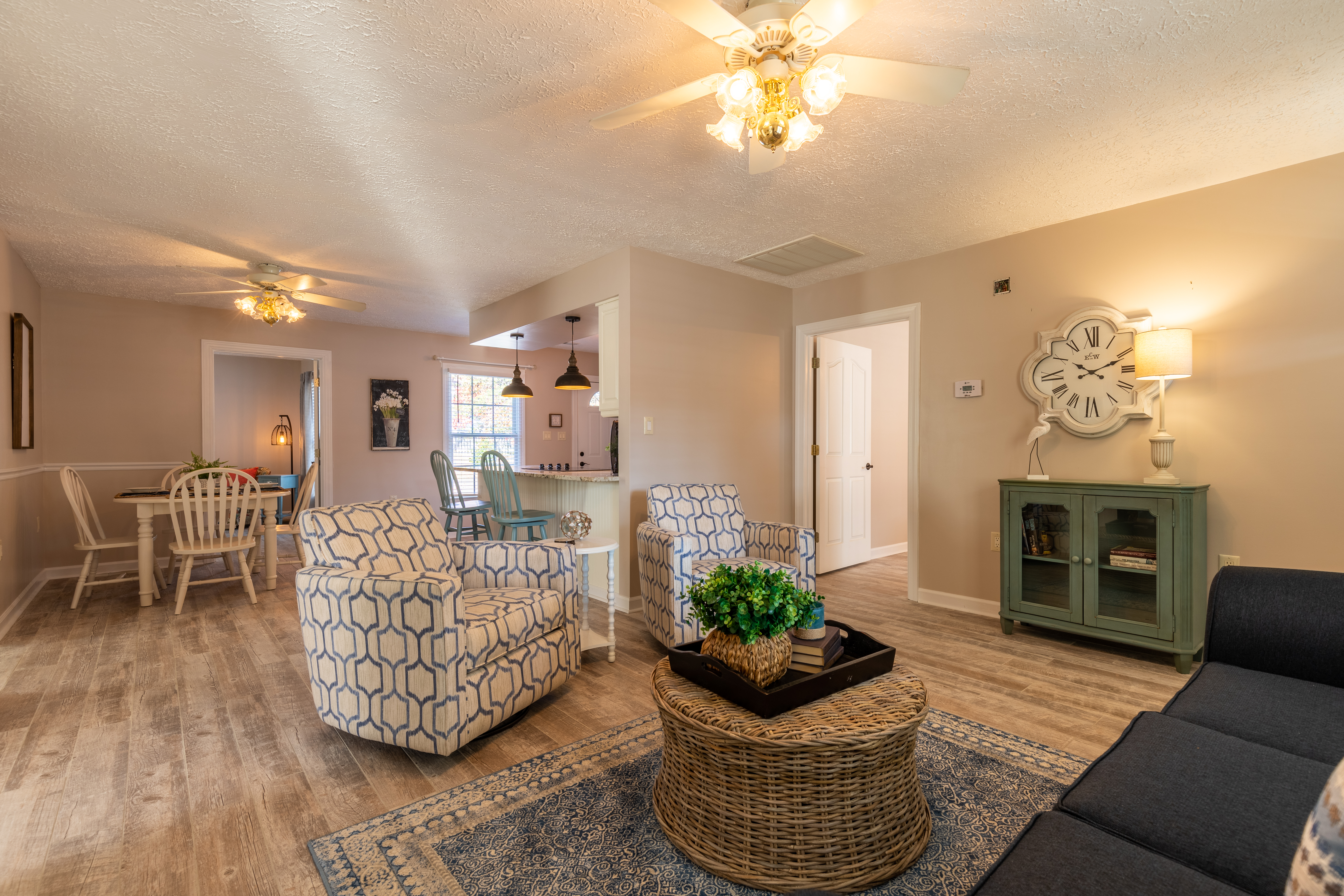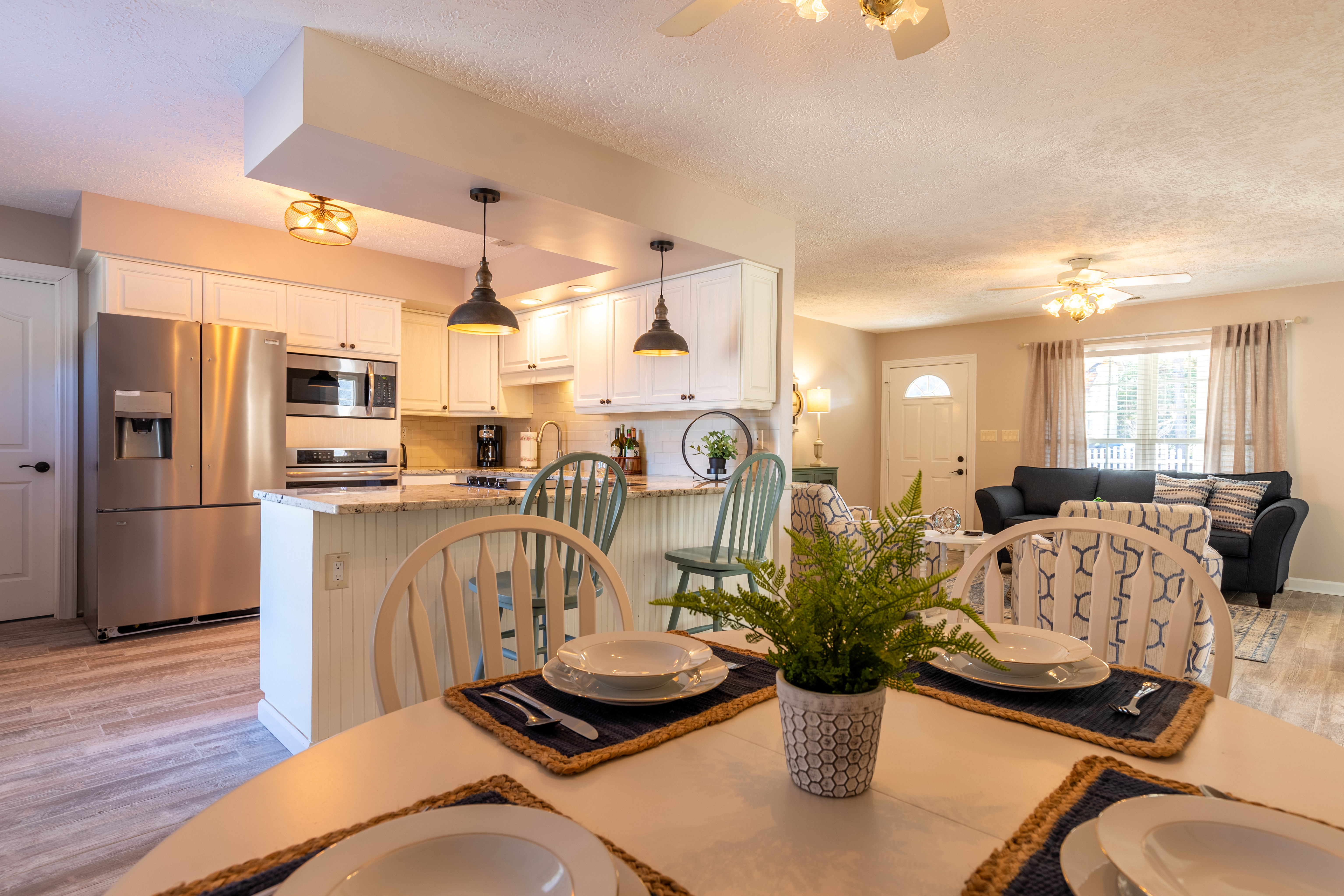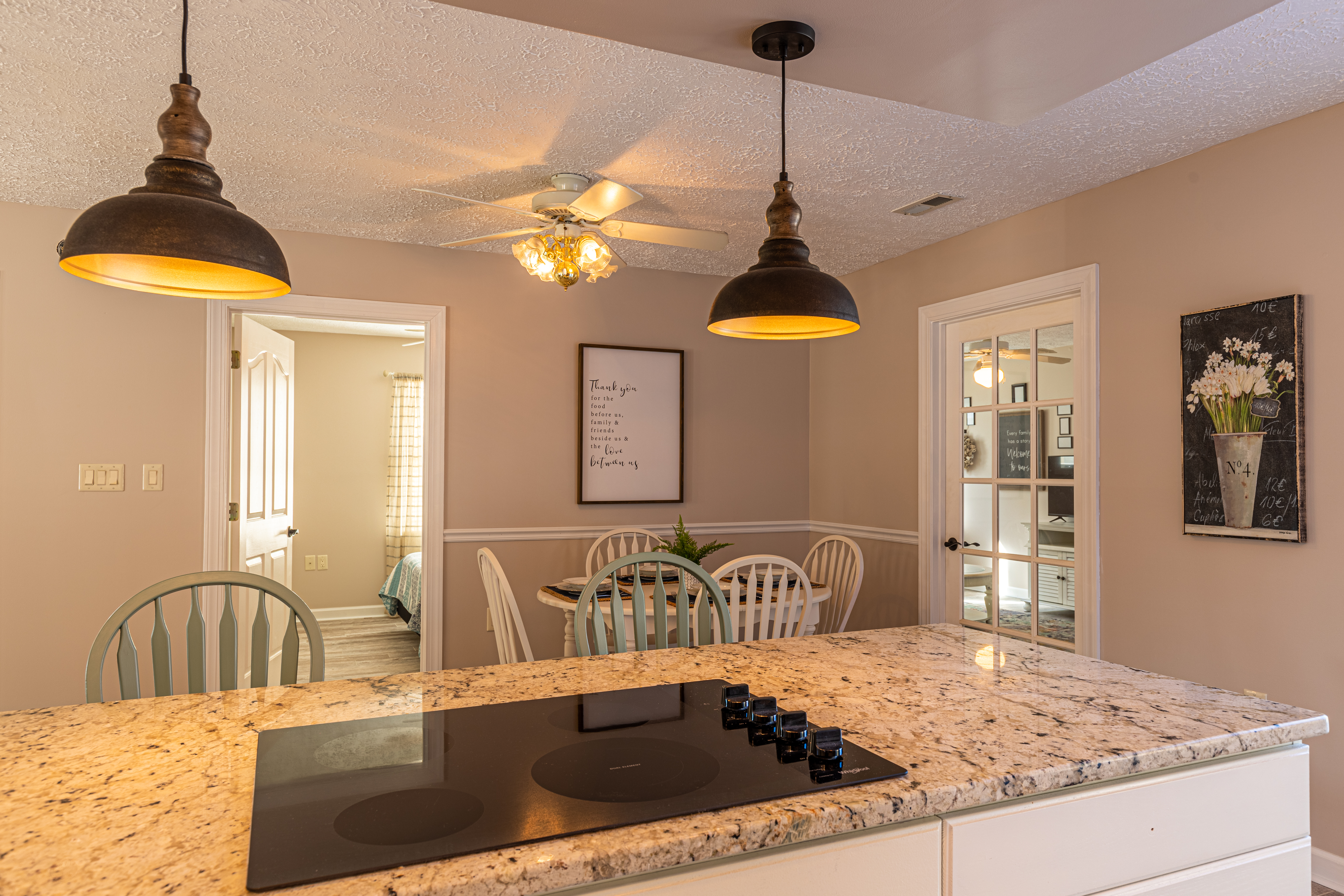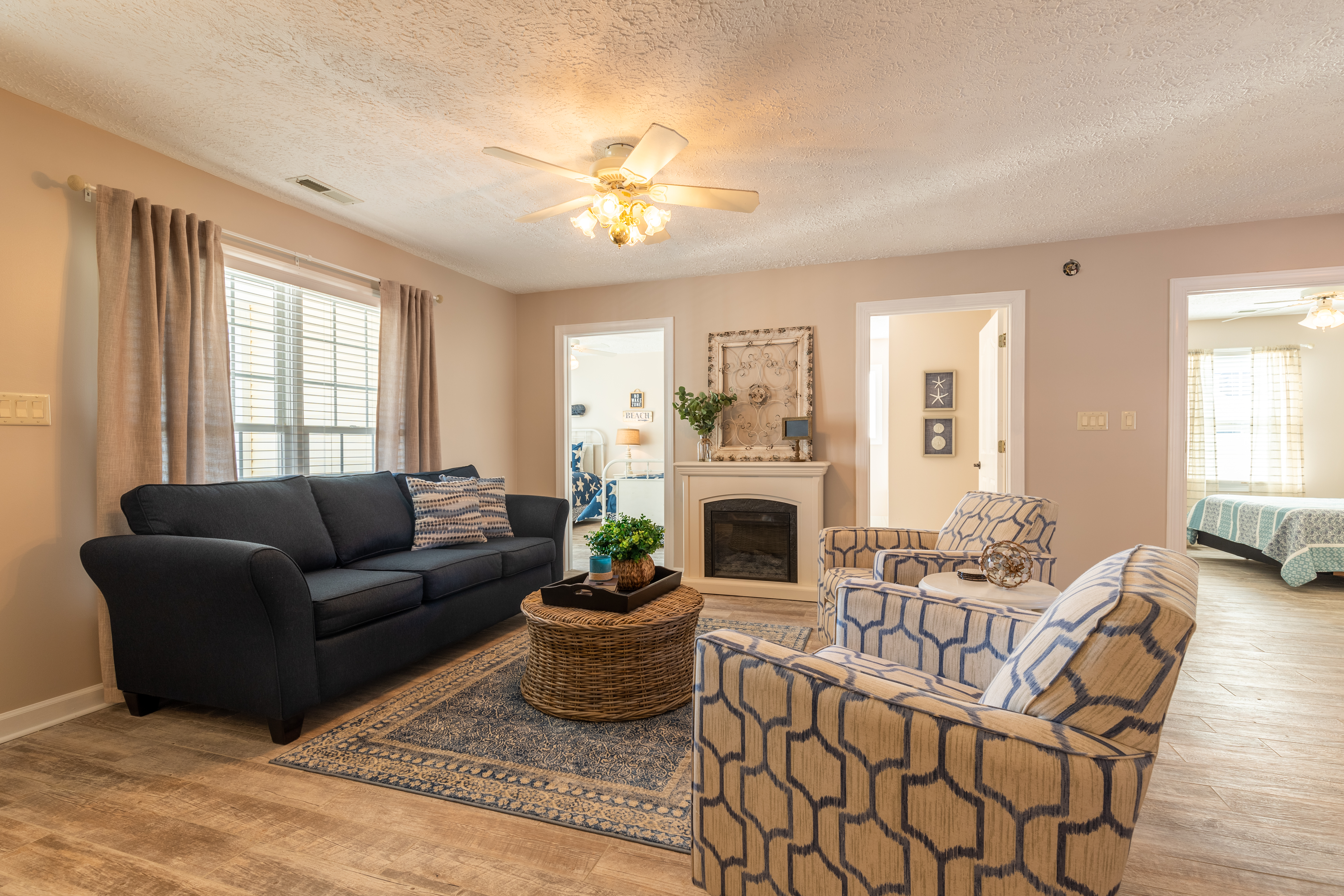 At the front entry, a cozy sitting room welcomes you with an electric fireplace for cool nights. Then, there is also a separate family room, nicely furnished with its own tv, to give everyone a little extra space. The dining area seats 6 comfortably and three stools for the breakfast bar. There is a large, walk-in laundry room, with full size washer and dryer. Of course, free Wi-Fi is included within the home.