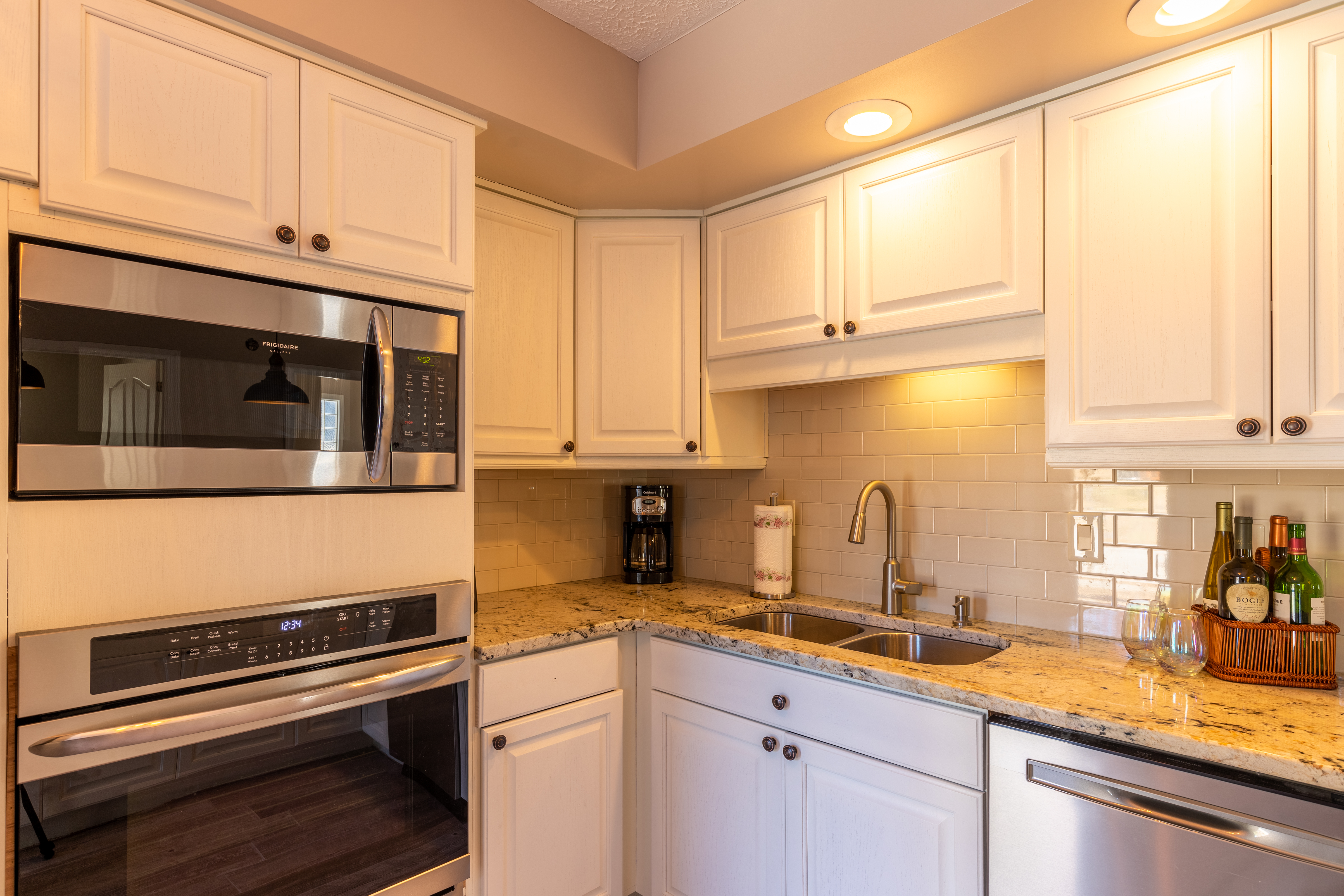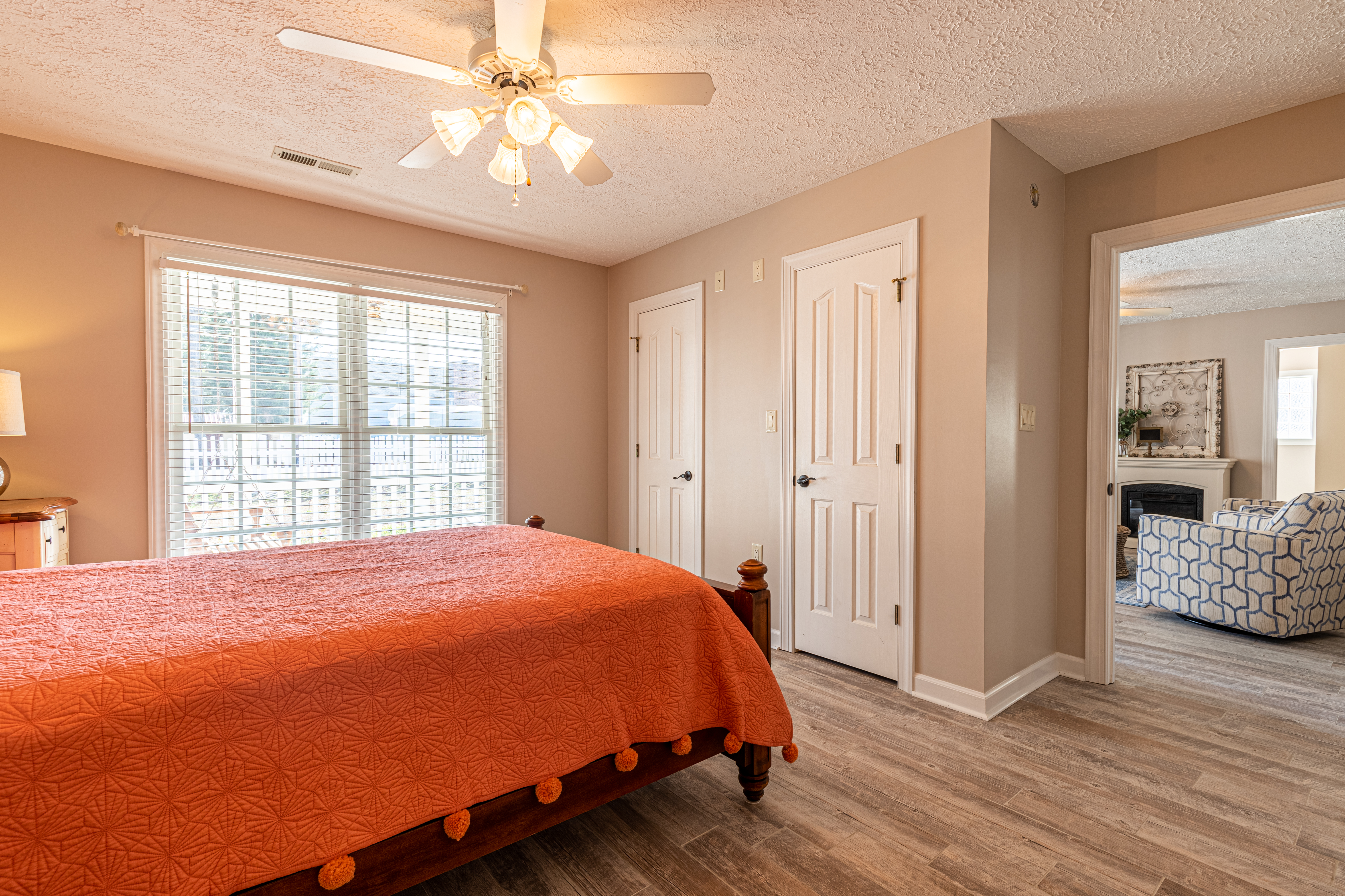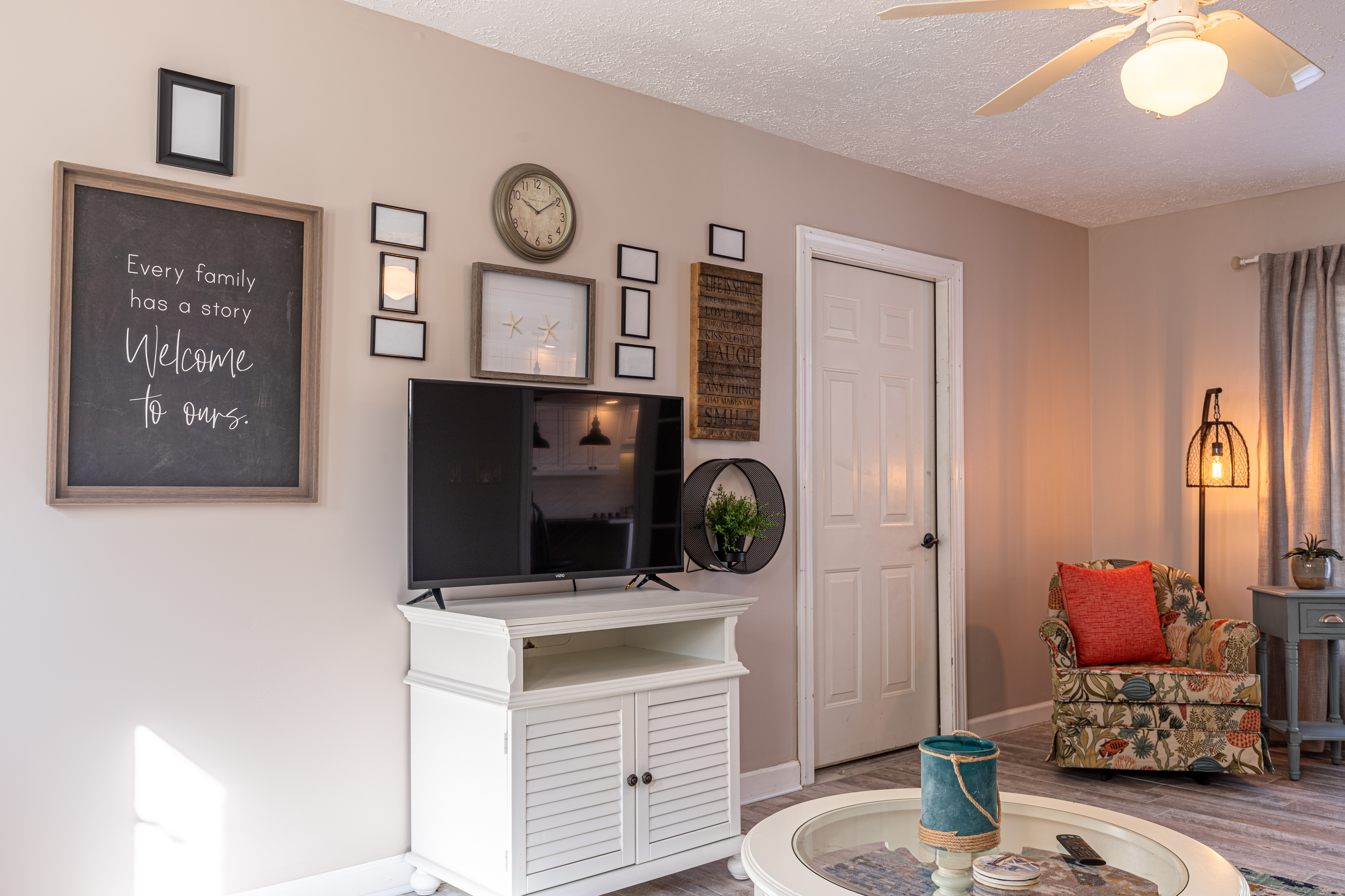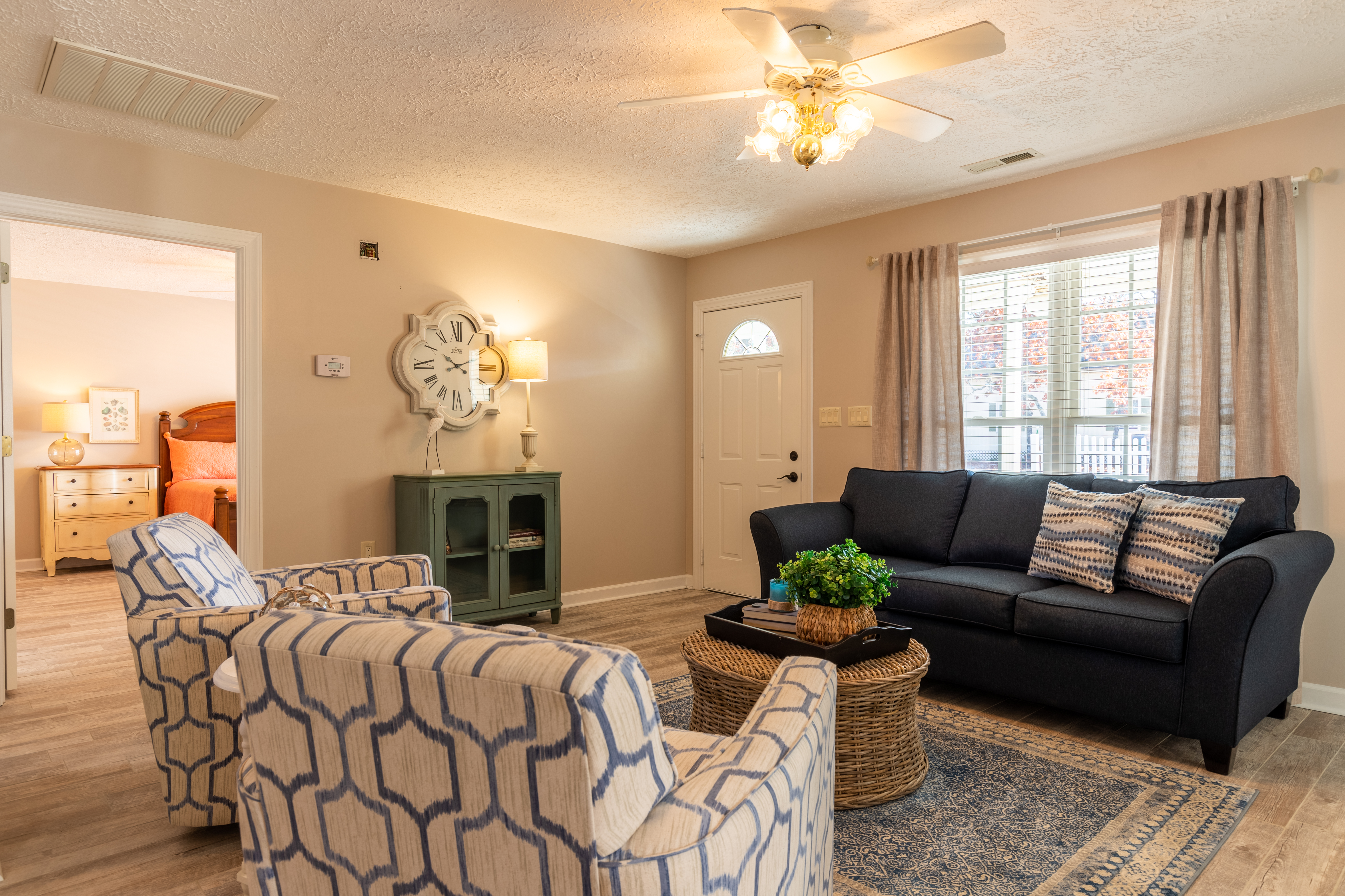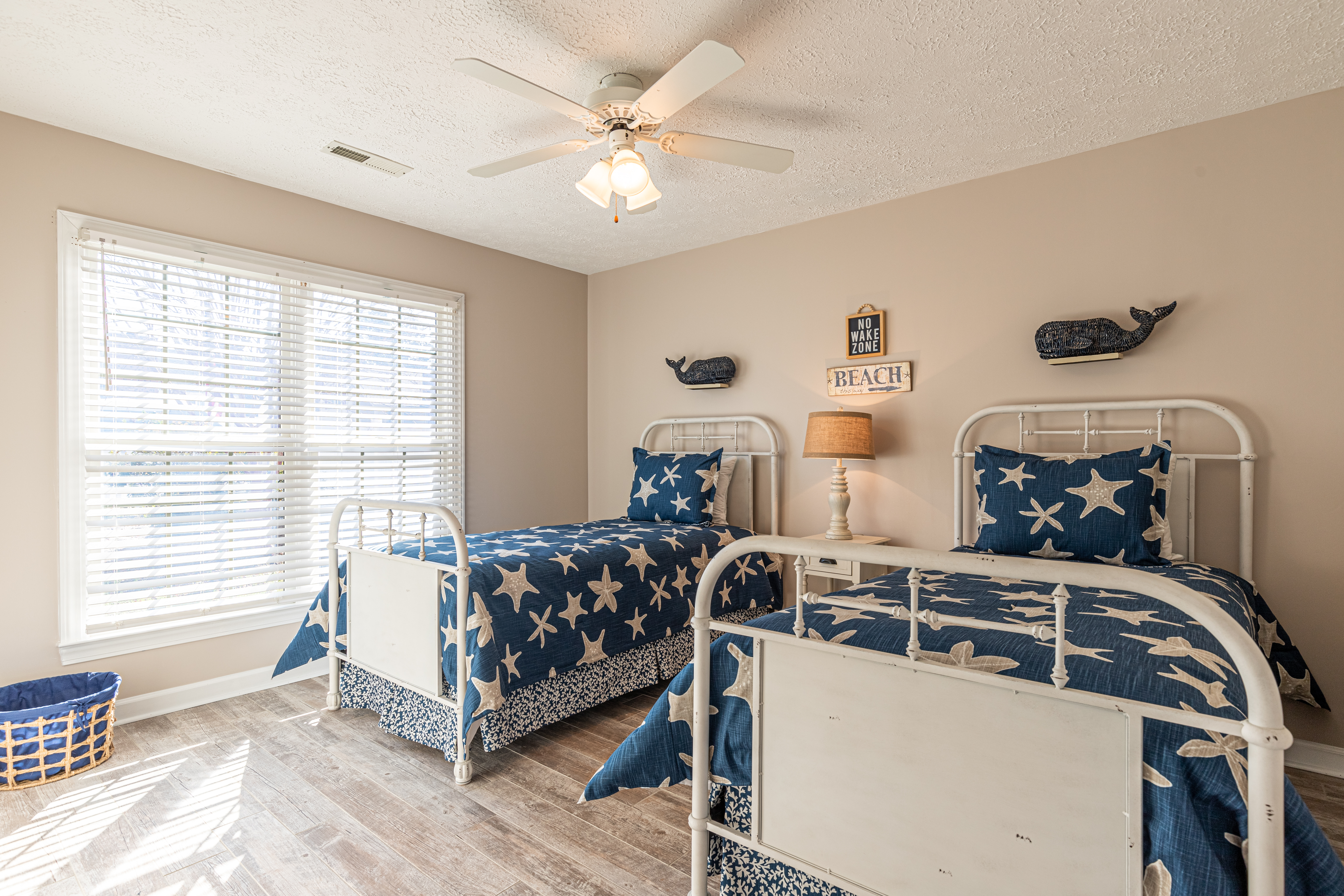 At the front entry, a cozy sitting room welcomes you with an electric fireplace for cool nights. Then, there is also a separate family room, nicely furnished with its own tv, to give everyone a little extra space. The dining area seats 6 comfortably and three stools for the breakfast bar. There is a large, walk-in laundry room, with full size washer and dryer. Of course, free Wi-Fi is included within the home.
