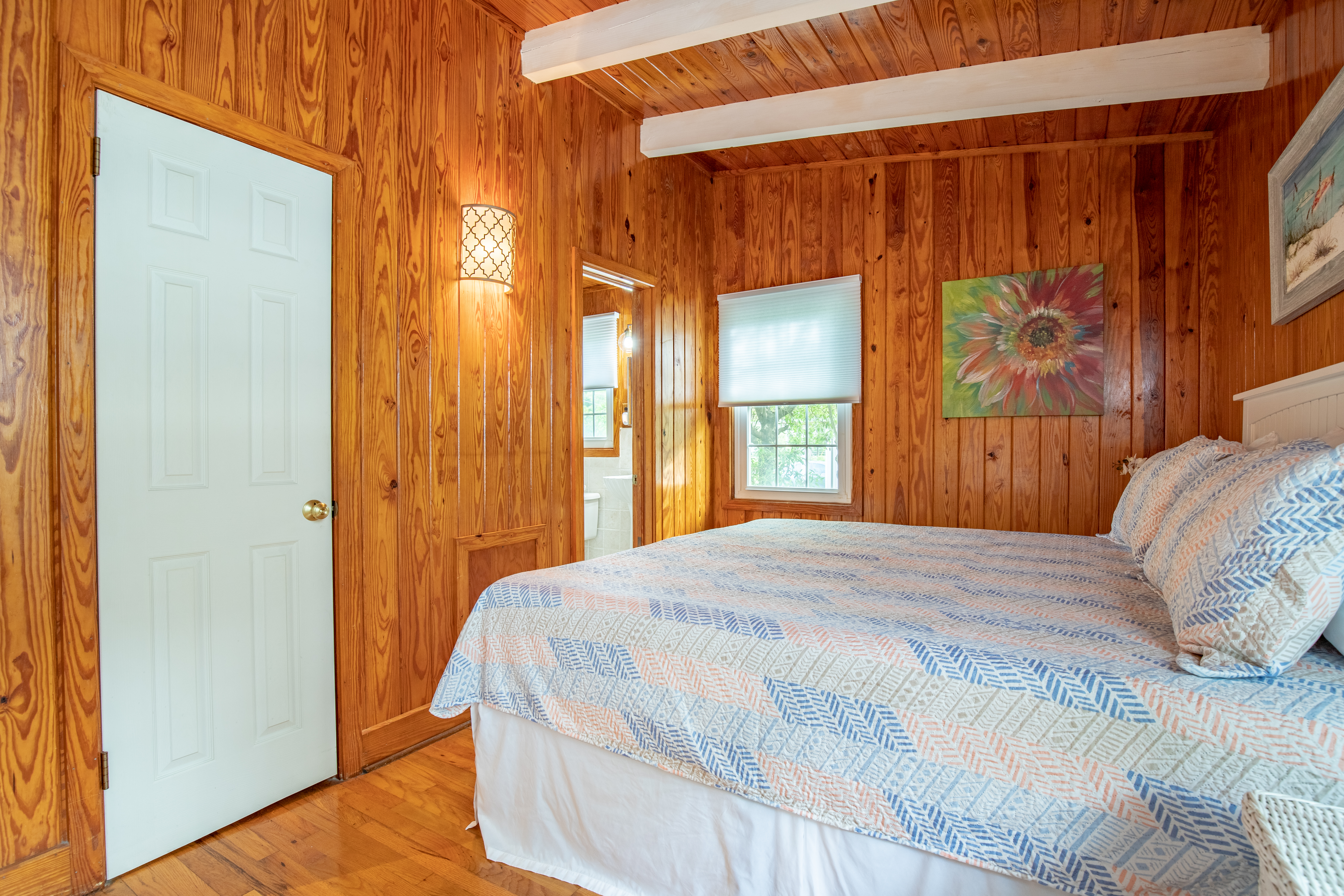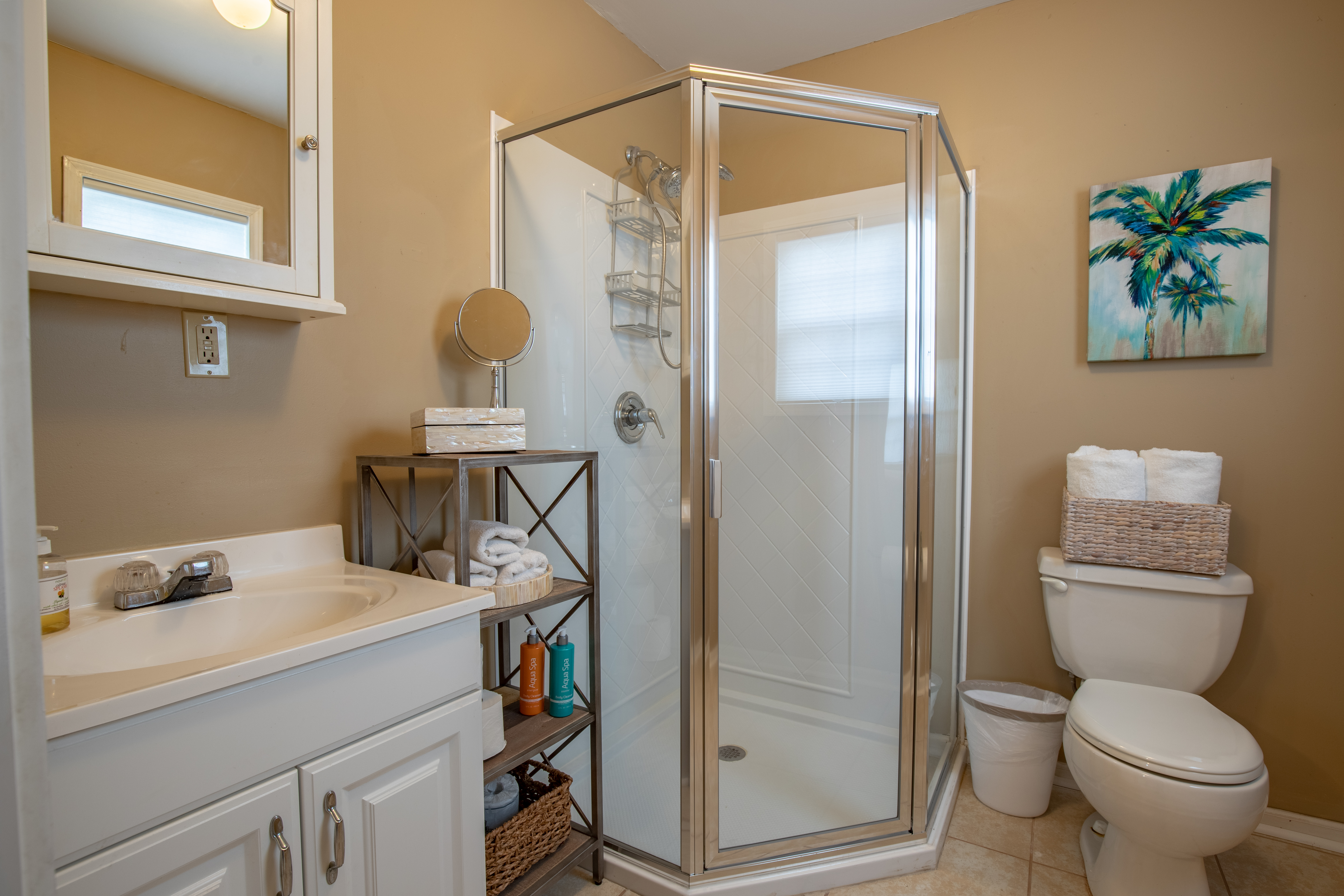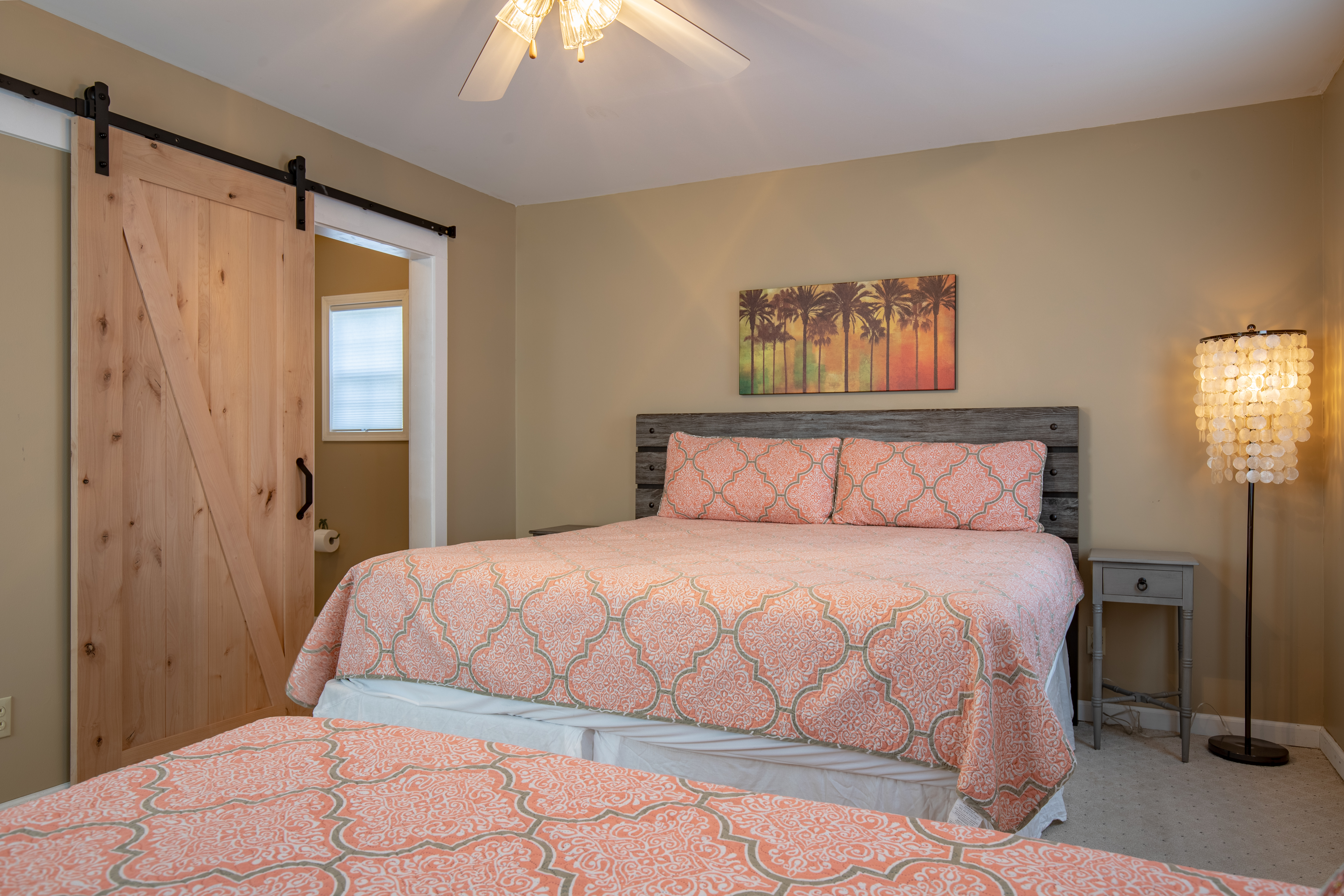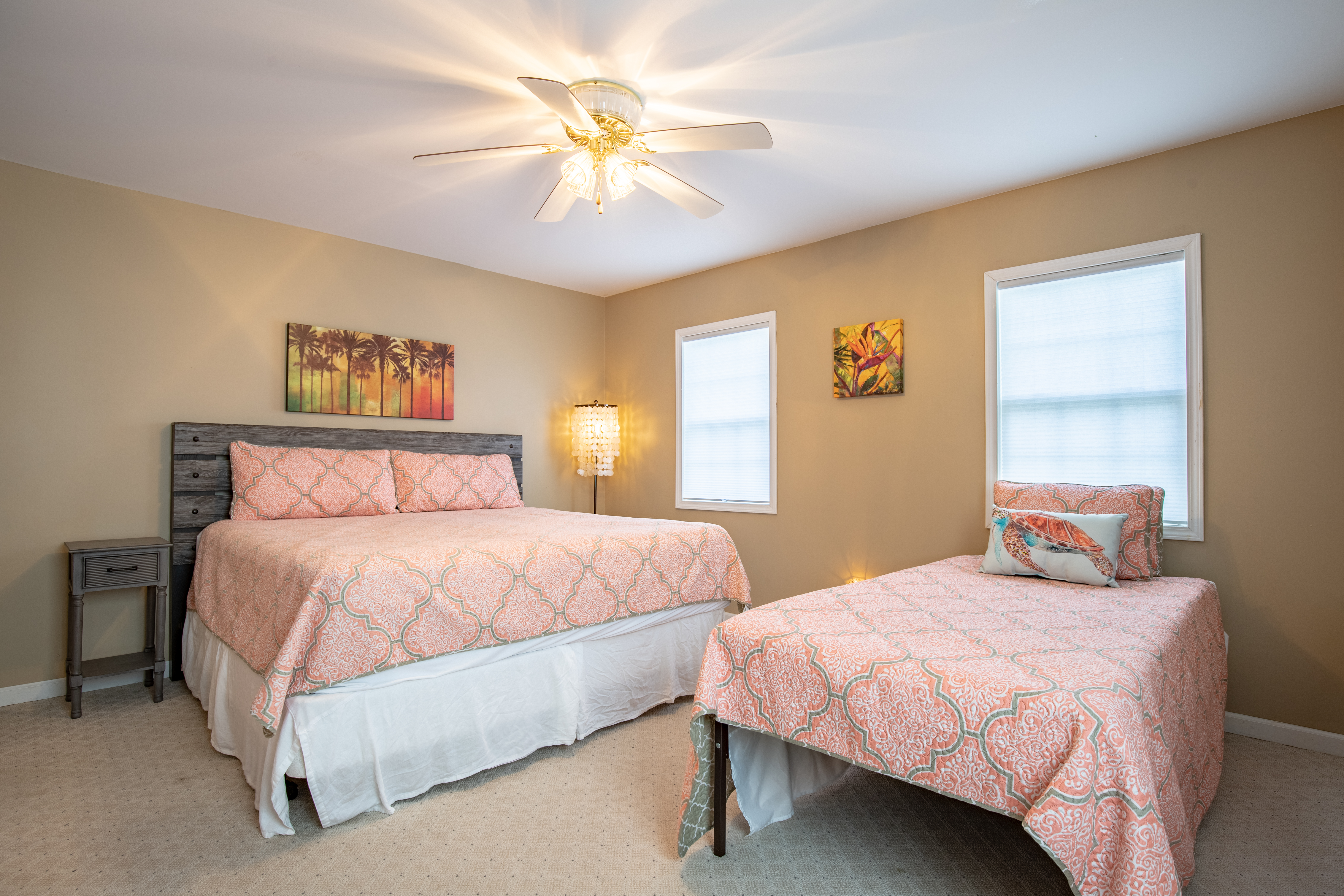 The downstairs guest room with 2 Queens, has its own private bath/shower combo. The downstairs guest room with 2 Twins, shares a bath (shower stall only) with the downstairs King guest room. Upstairs is a private master suite with a great King bed and a single Twin bed. The master offers a great remodeled bathroom (glass shower only). There is an additional twin day bed, for one extra person, downstairs in the front sun-porch entry area.