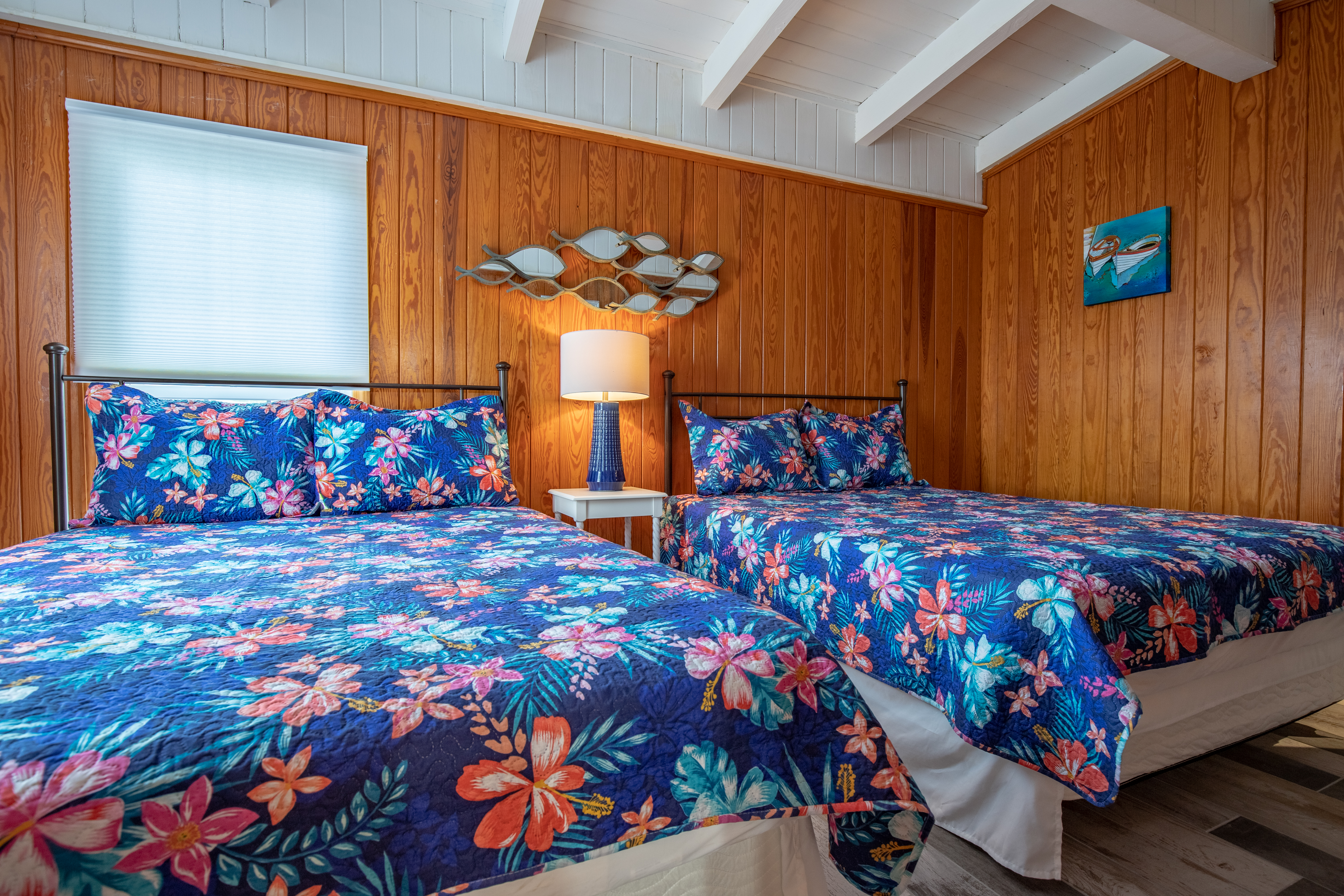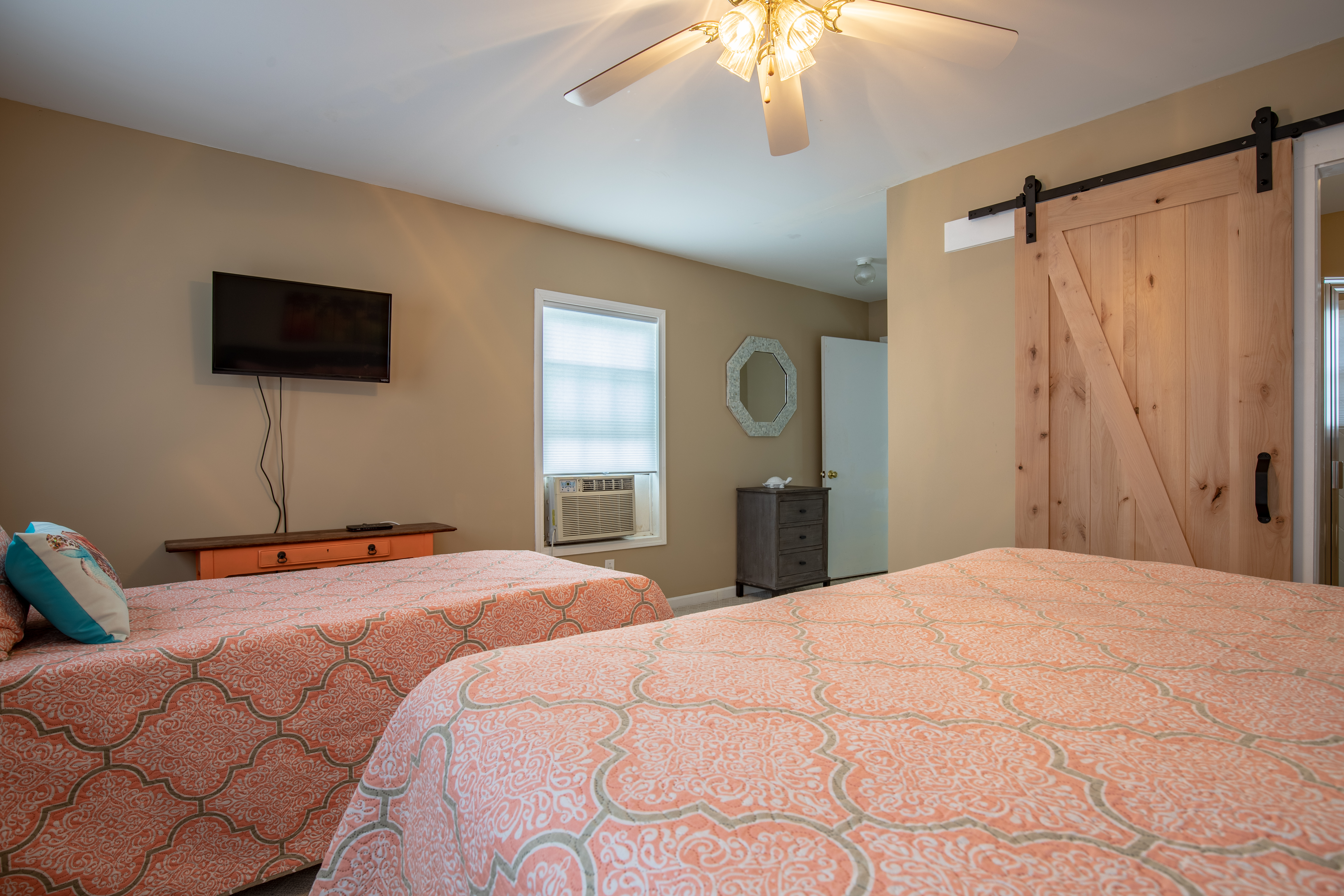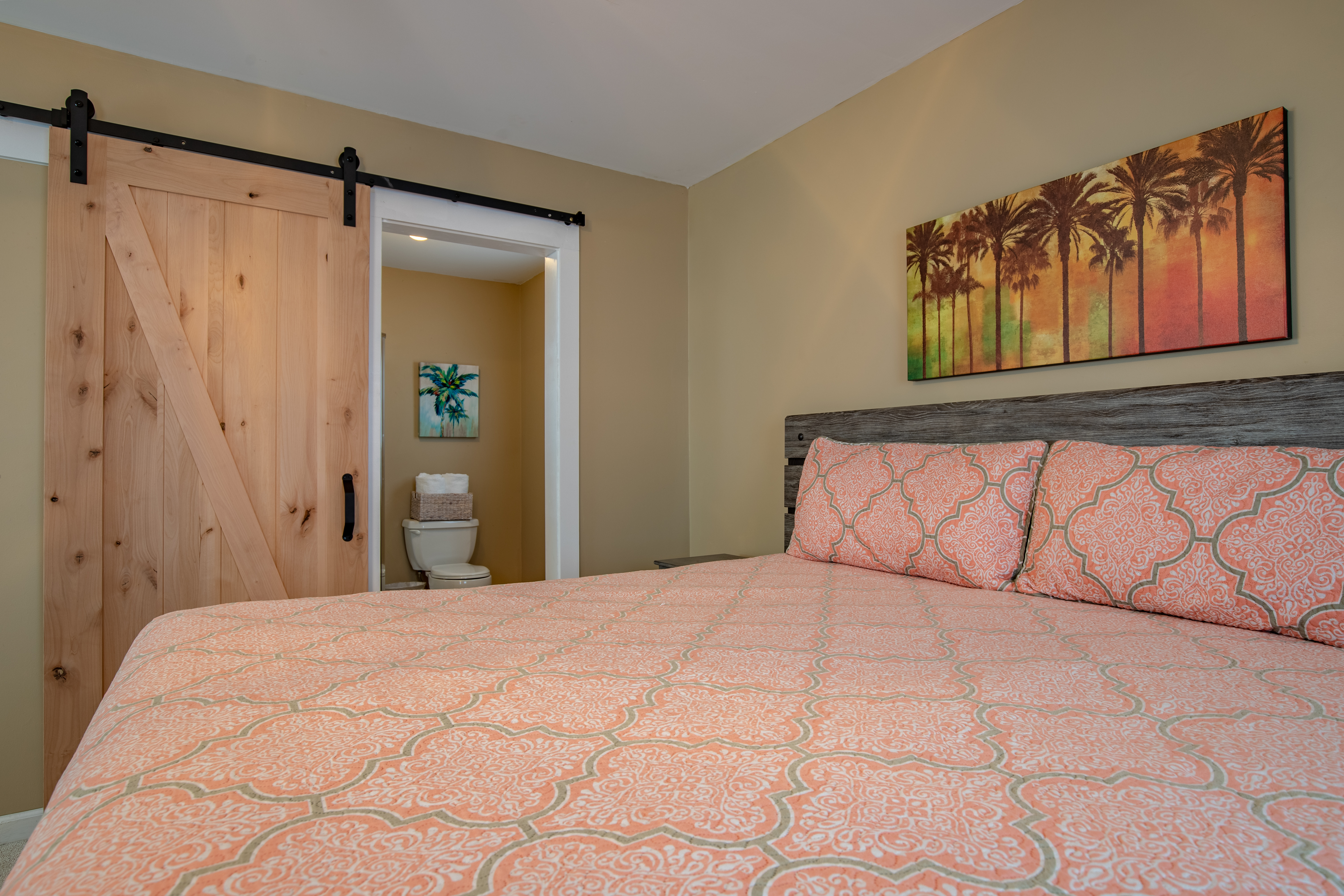 The downstairs guest room with 2 Queens, has its own private bath/shower combo. The downstairs guest room with 2 Twins, shares a bath (shower stall only) with the downstairs King guest room. Upstairs is a private master suite with a great King bed and a single Twin bed. The master offers a great remodeled bathroom (glass shower only). There is an additional twin day bed, for one extra person, downstairs in the front sun-porch entry area.