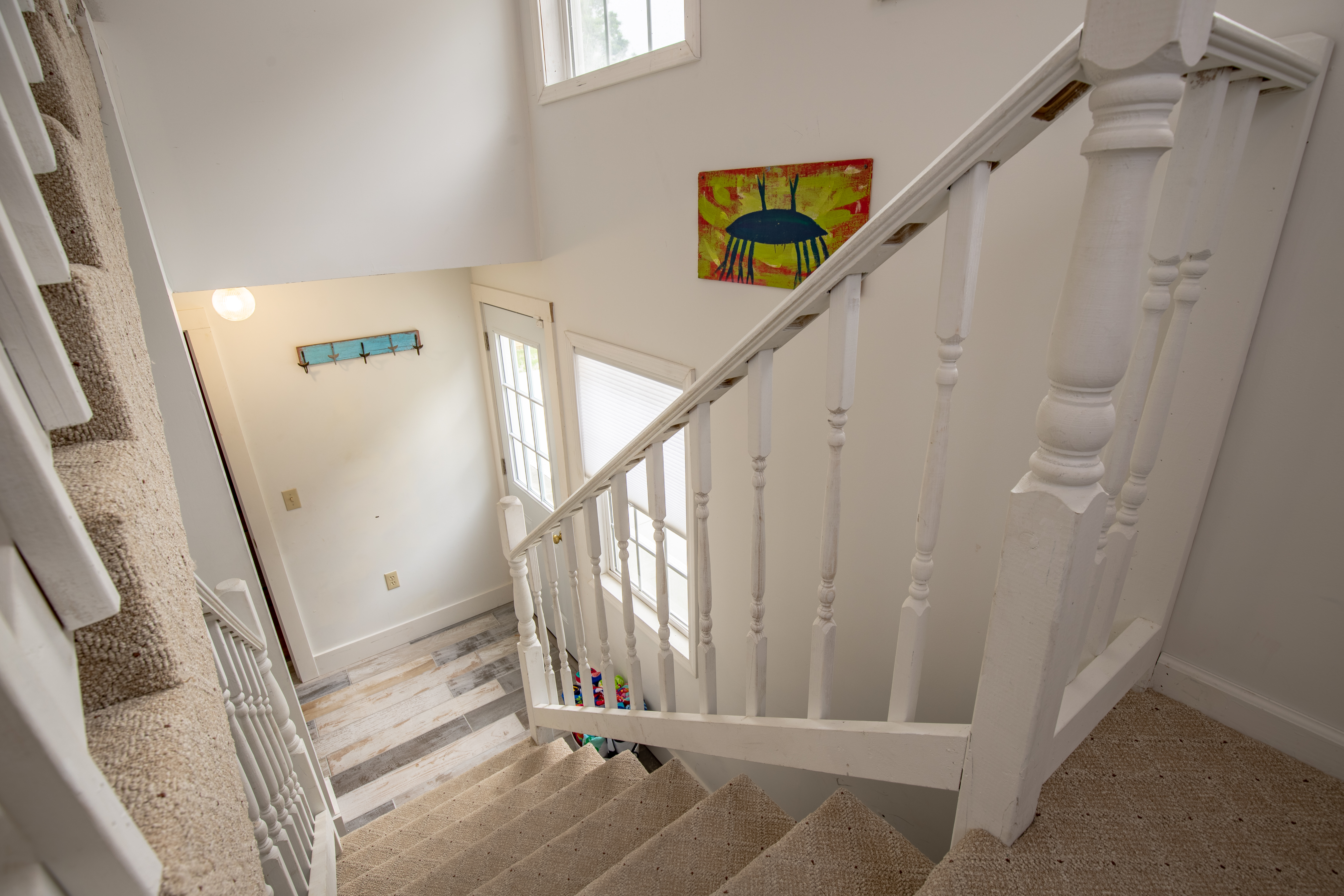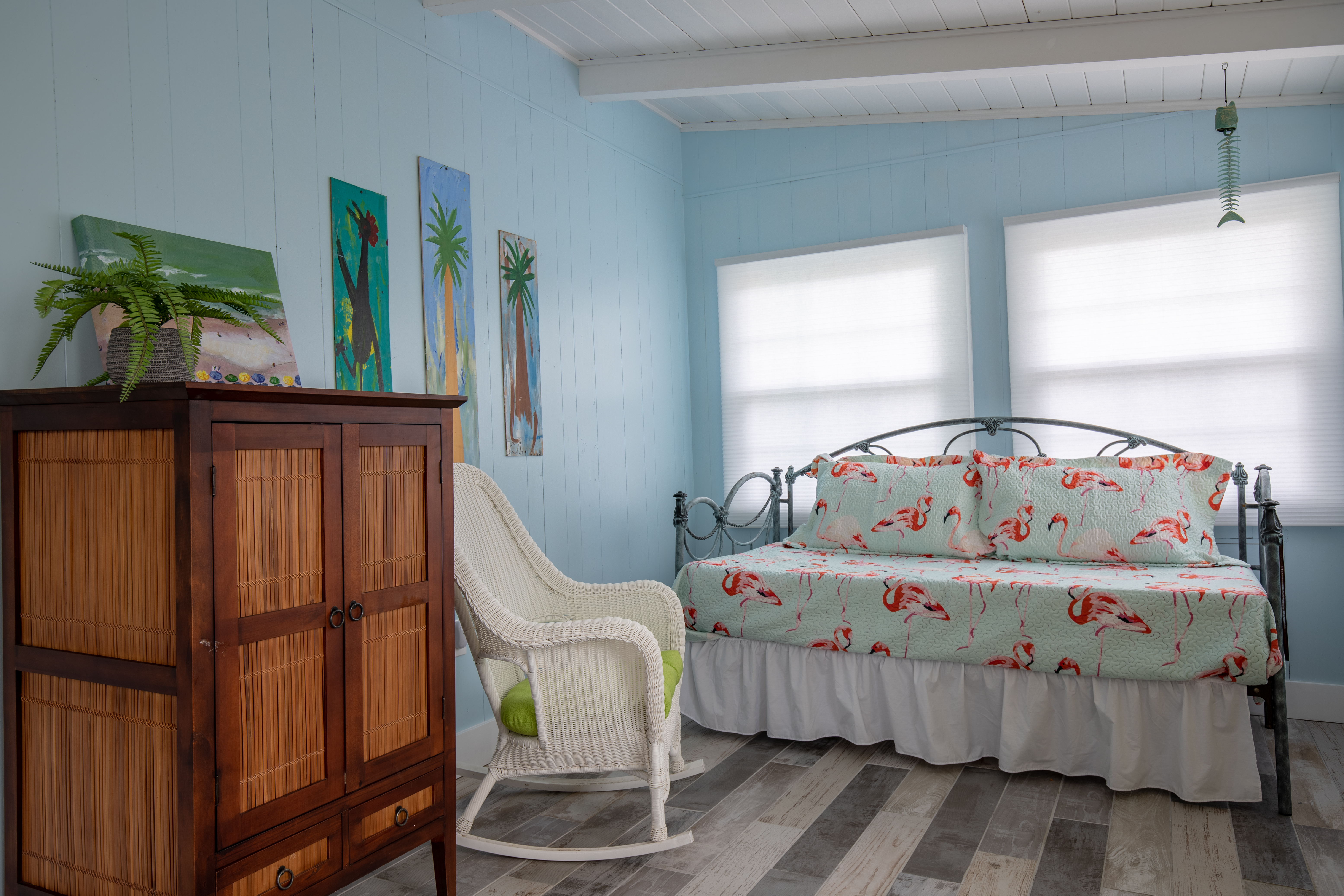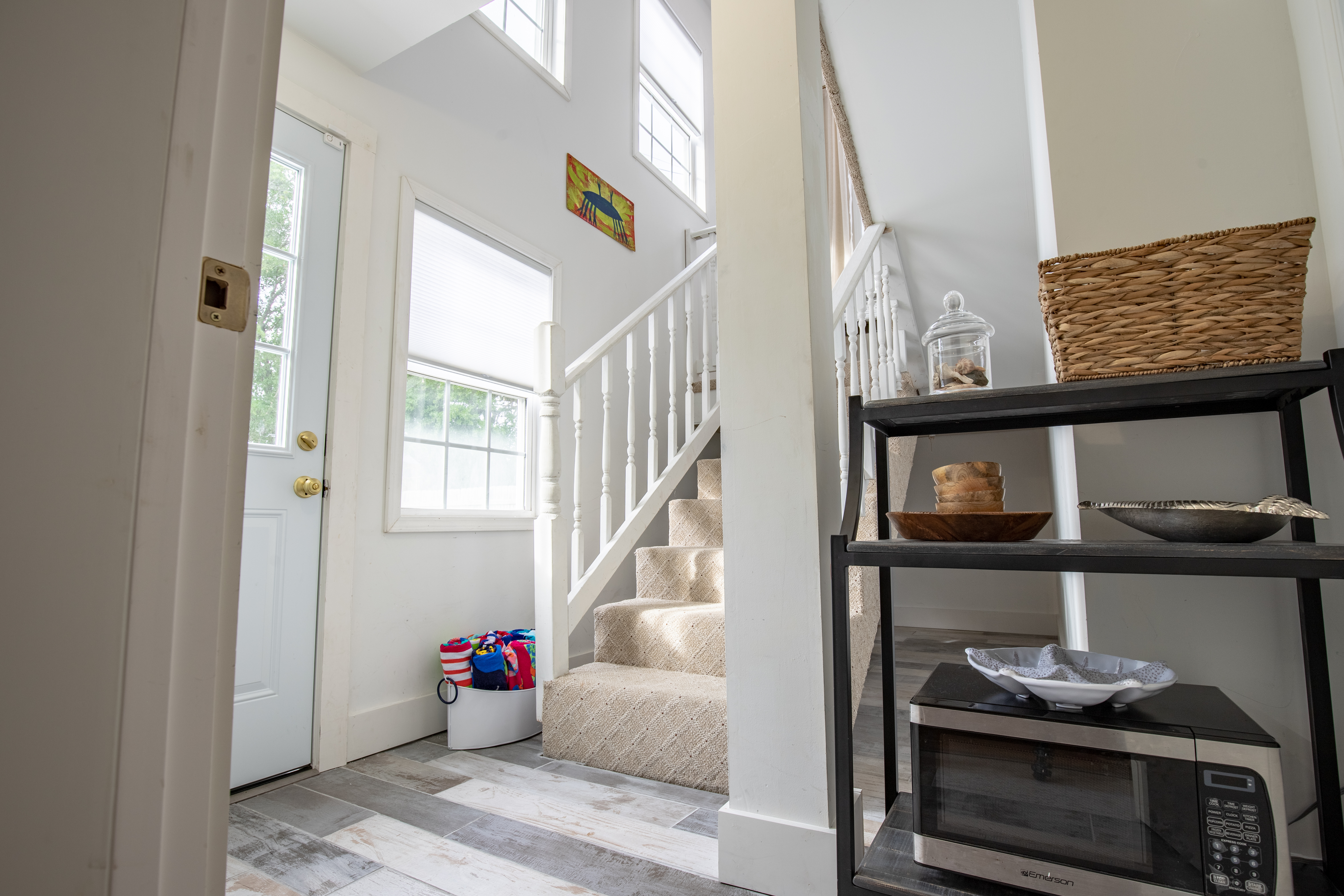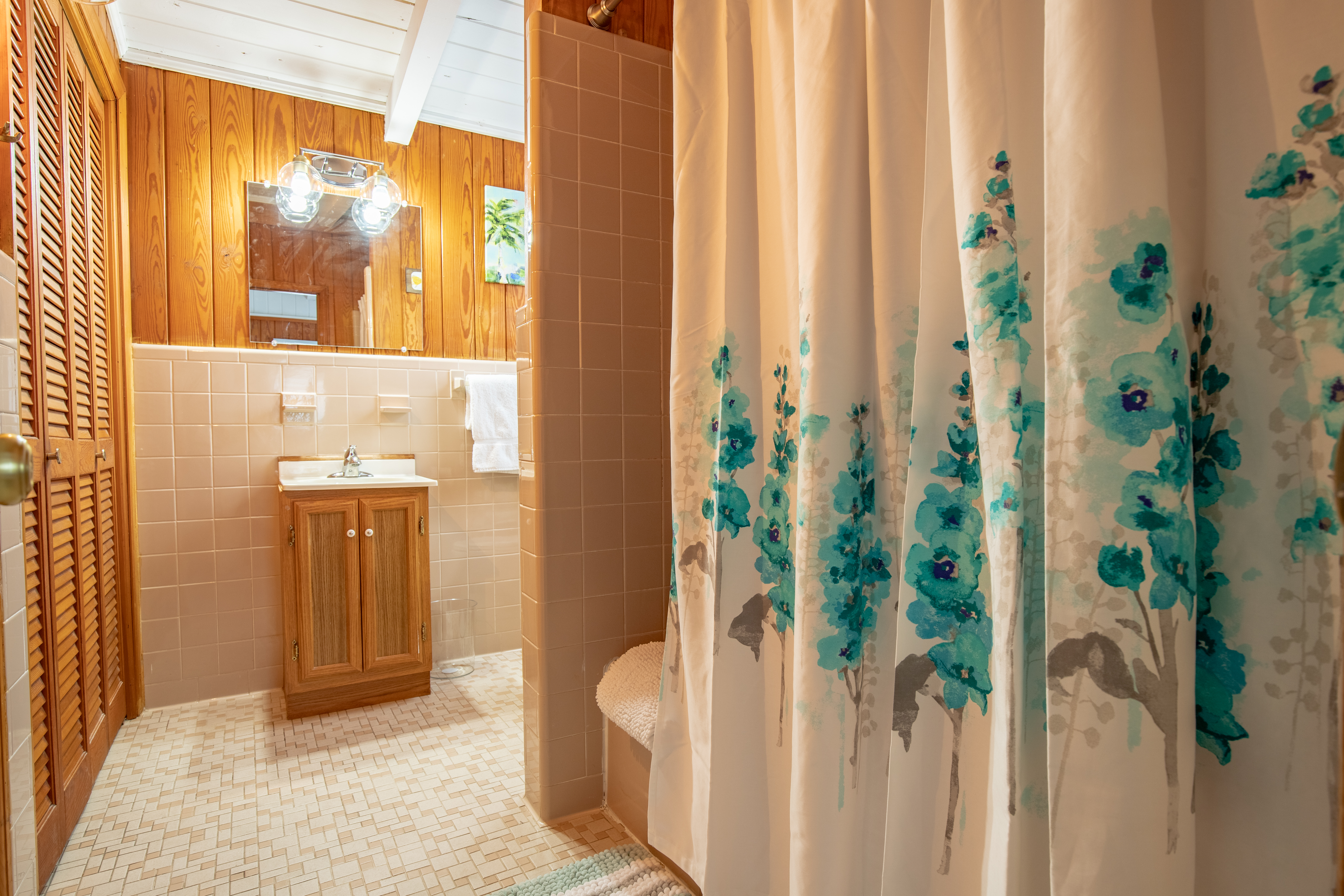 The downstairs guest room with 2 Queens, has its own private bath/shower combo. The downstairs guest room with 2 Twins, shares a bath (shower stall only) with the downstairs King guest room. Upstairs is a private master suite with a great King bed and a single Twin bed. The master offers a great remodeled bathroom (glass shower only). There is an additional twin day bed, for one extra person, downstairs in the front sun-porch entry area.