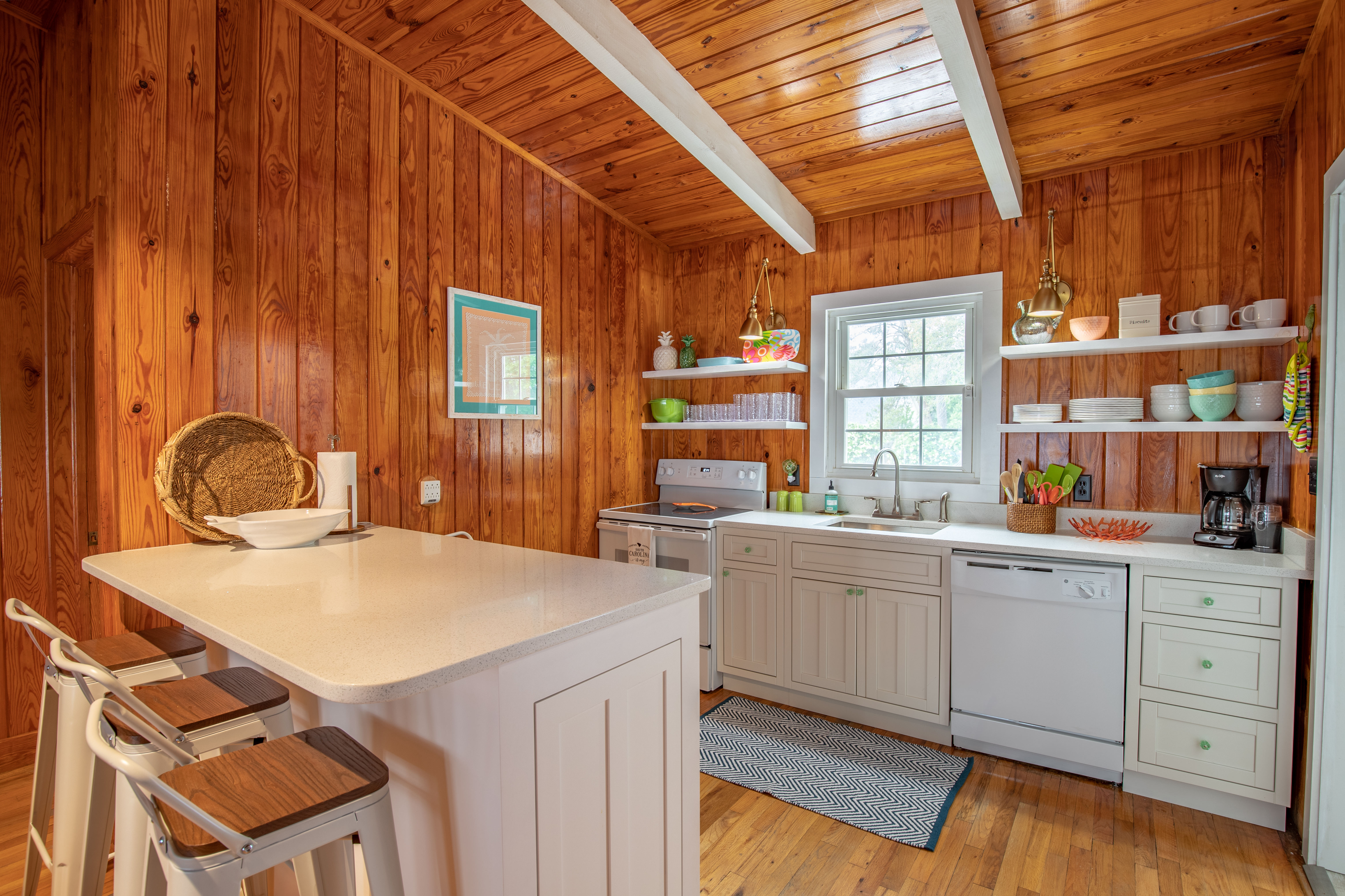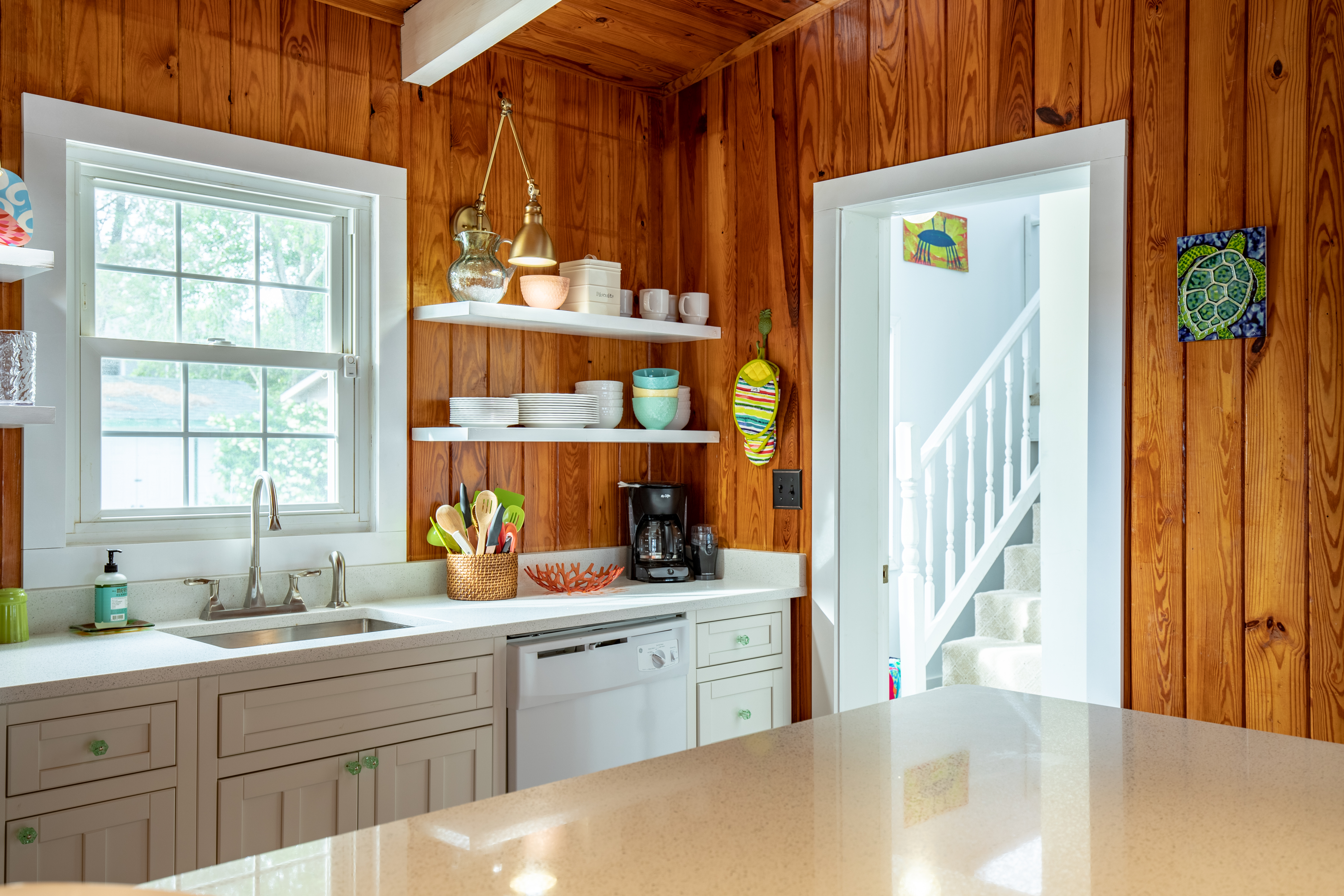 The stylish kitchen has been smartly updated with all new appliances, quartz countertops and everything you will need to make that scrumptious local seafood dinner. You can grill by the pool, or take a break and just pick up take out, after all it is vacation!. There is a large pantry off the kitchen offering plenty of shelf space for weekly supplies and extra kitchen necessities are perfectly stored. A brand new full-size washer and dryer set are easily accessible.