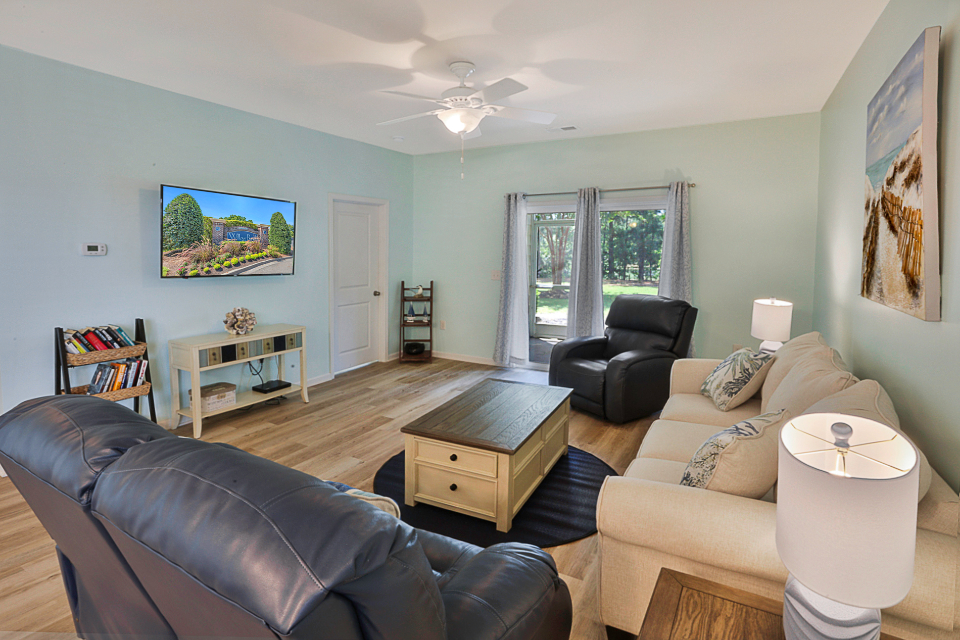 Living Room: Sofa and 2 reclining occasional chairs, 50' flat screen smart TV, and access to the rear, screened-in patio overlooking golf coarse pond and peaceful natural area.