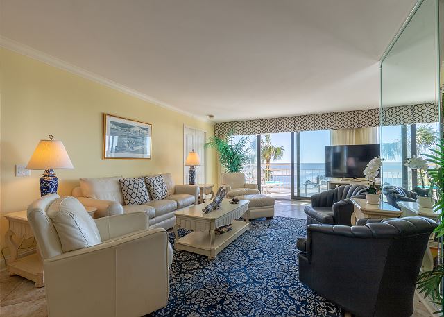 Our beautiful condo has two inviting living room areas with two lovely leather sleeper sofas,six big comfy chairs and a HUGE TV; so gather round, watch a movie or sit and share your beach day events. There is room for it all here. There are two lovely dining areas where the entire family can gather and plan what to do next or to partake in a meal prepared with some of our local seafood in the well appointed kitchen, with all the comforts of home. There is also an outdoor dining table that will give you the ultimate waterfront al-fresco setting for dinner -- you won't need a reservation here! Don't miss out on this beautiful condo. Your dream vacation awaits you!